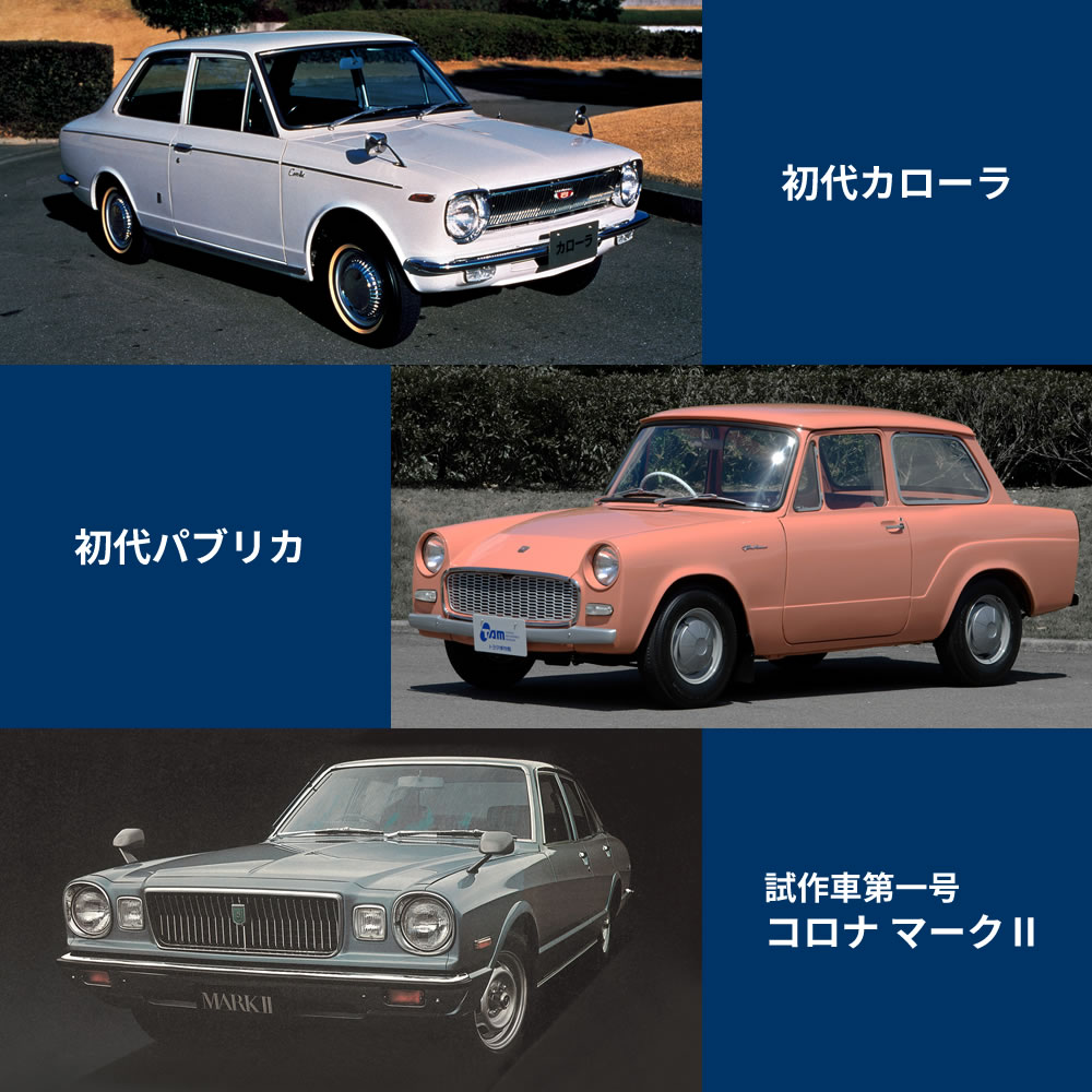 出典:初代カローラ/トヨタ自動車株式会社 公式企業サイト、初代パブリカ/トヨタ自動車株式会社 公式企業サイト、コロナ マークⅡ/トヨタ自動車株式会社 公式企業サイトより