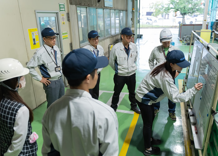昼前と夕方にミーティングを実施。営業・品質保証部・物流が納品の段取りをするため情報を共有。